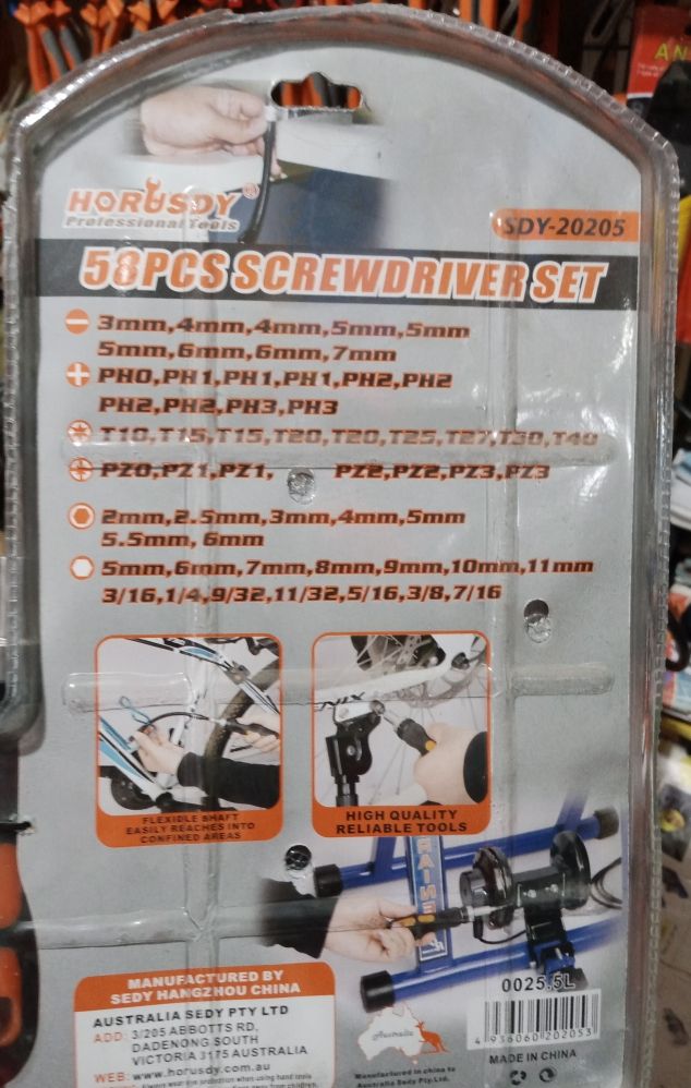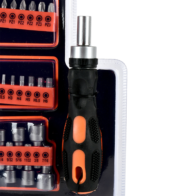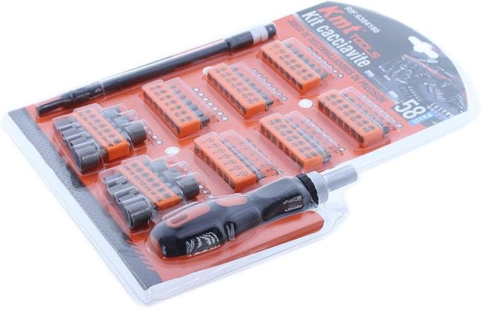 L’ensemble complet vous permet de travailler avec les types de fentes les plus courants, notamment PH (Phillips), PZ (Pozidriv), T (Torx), ainsi que des buses plates et hexagonales. Les buses sont idéales pour l’entretien des voitures, des appareils électroménagers, des ordinateurs et d’autres appareils. Chaque élément de l’ensemble est solidement fixé dans le support, ce qui évite qu’ils ne soient perdus pendant le fonctionnement.
