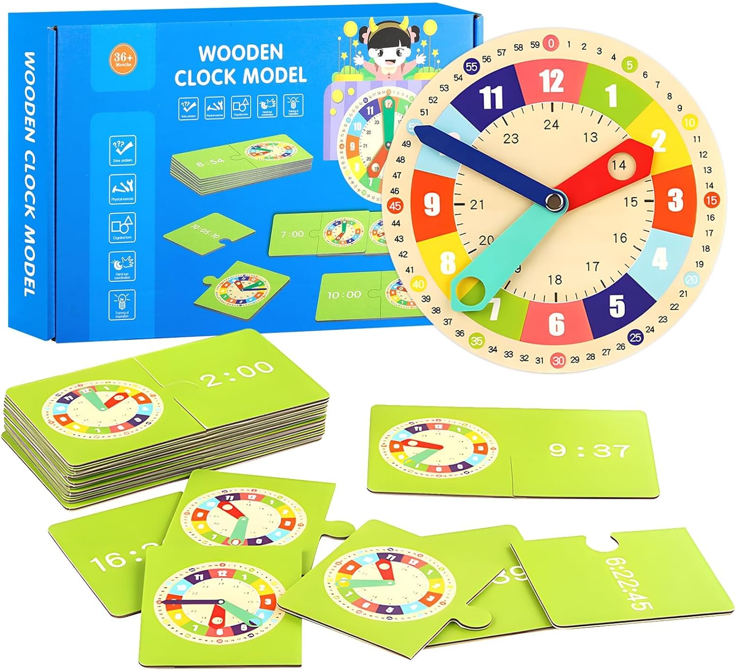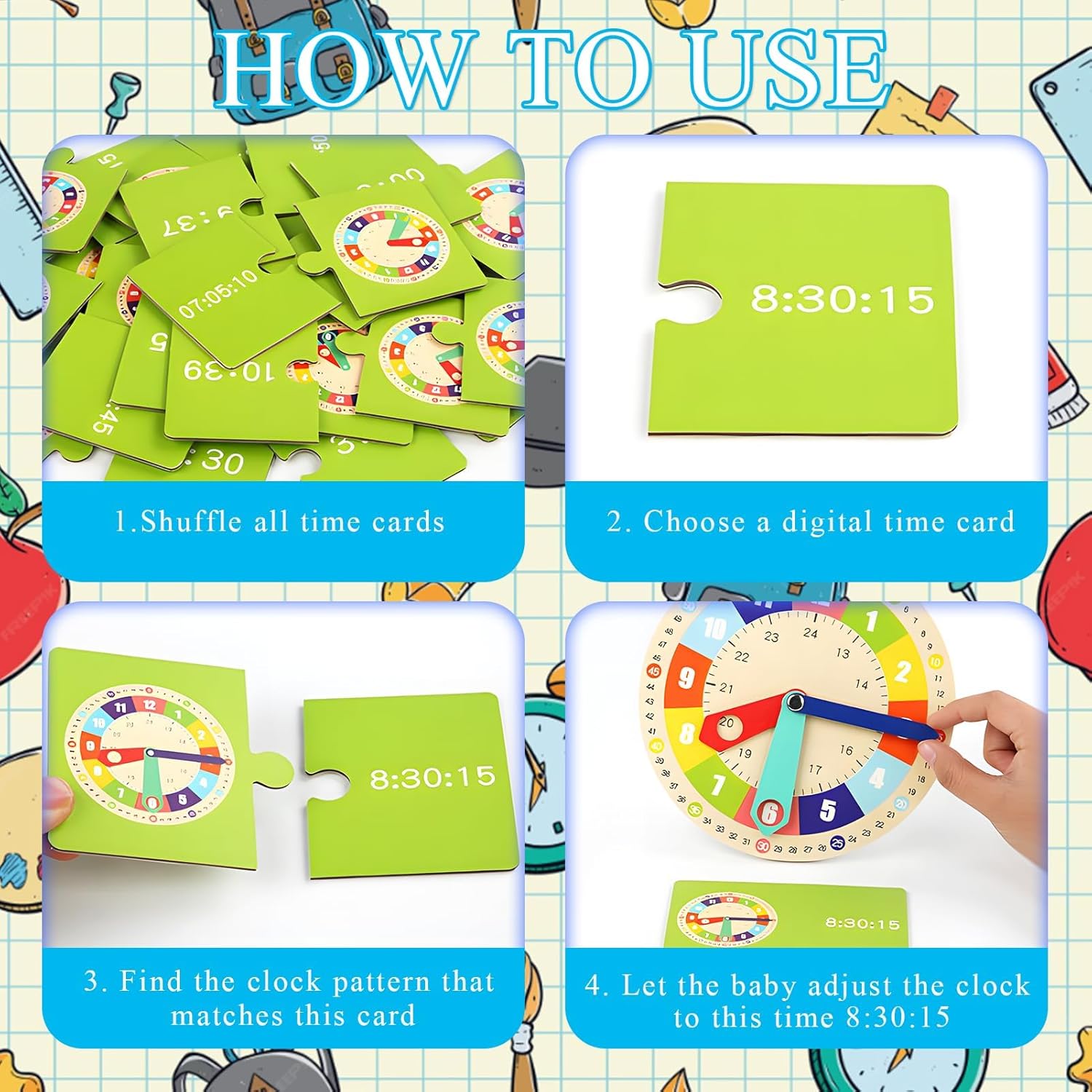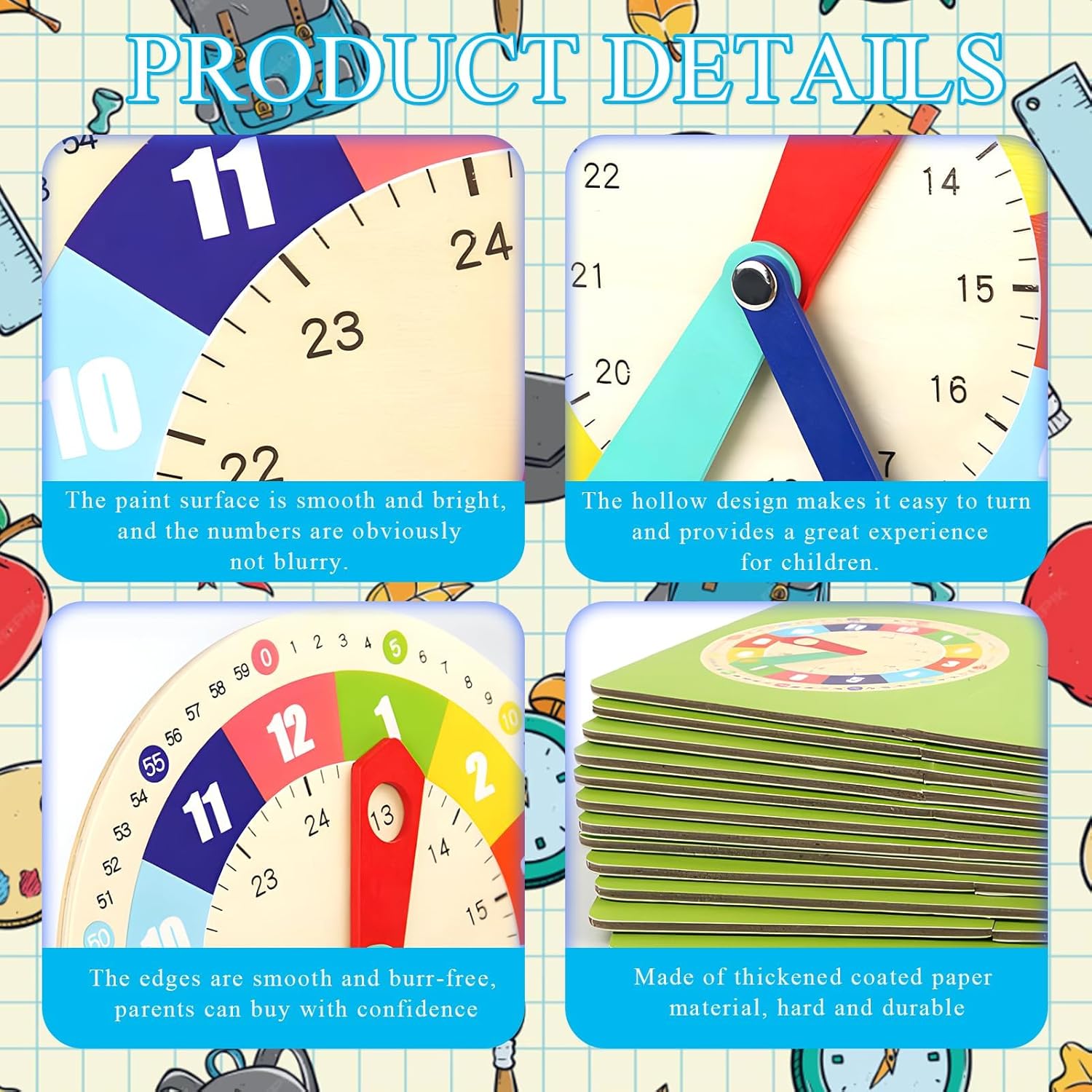 • 【Développement Intellectuel】Les enfants peuvent déplacer l’aiguille des heures, des minutes et des secondes à travers l’heure indiquée sur la carte, apprenant d’une manière intéressante pour aider les enfants à apprendre facilement les connaissances sur le temps et les chiffres, ce qui est propice à l’éducation précoce des compétences de base en matière de chronométrage.