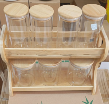 Set de 6 Boite de Cuisine en Verre Transparent avec Couvercles en Bois et Étagère Double